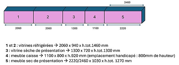 - Meuble de présentation sec : 2220/2460 x 1030 x h.tot. 1270 mm